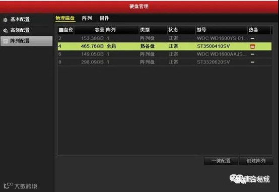 选择"阵列"属性页,进入阵列配置的"阵列"界面,如图所示。可查看一键创建阵列的容量、阵列类型、热备盘等信息。