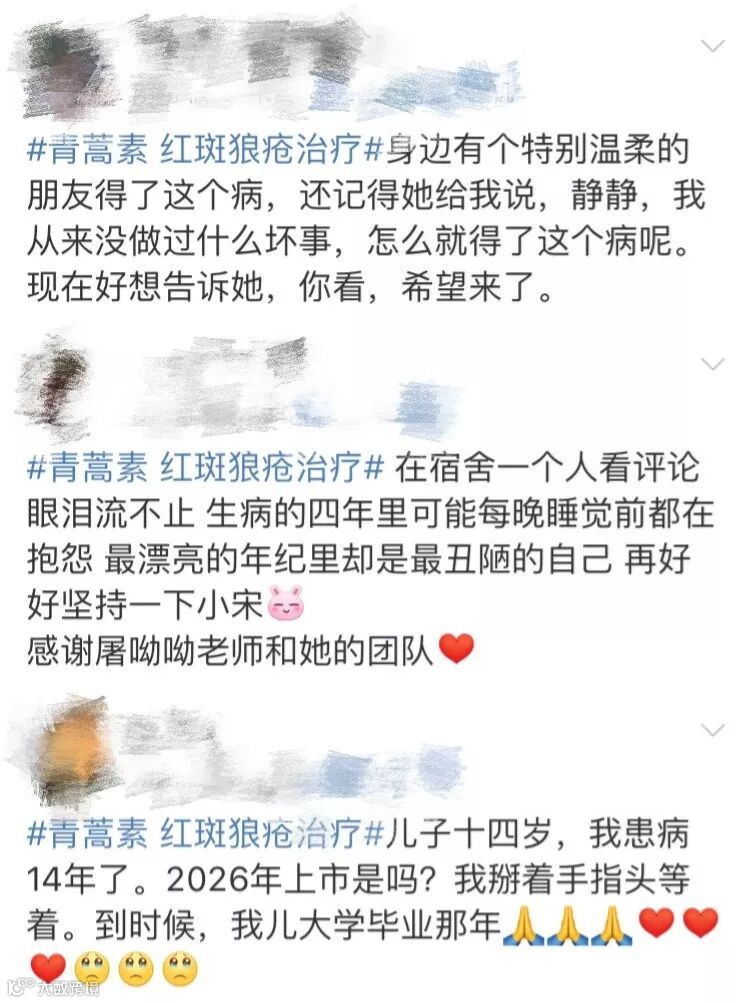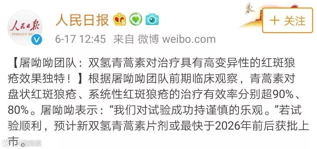 屠呦呦和她的团队根据临床试验一期观察,发现青蒿素对盘状红斑狼疮、系统性红斑狼疮的治疗有效率超90%、80%,且一期参加试验的500名患者还未出现预期之外的不良反应。临床试验共分为三期,若试验顺利,最快拟于2026年前后获批上市!
