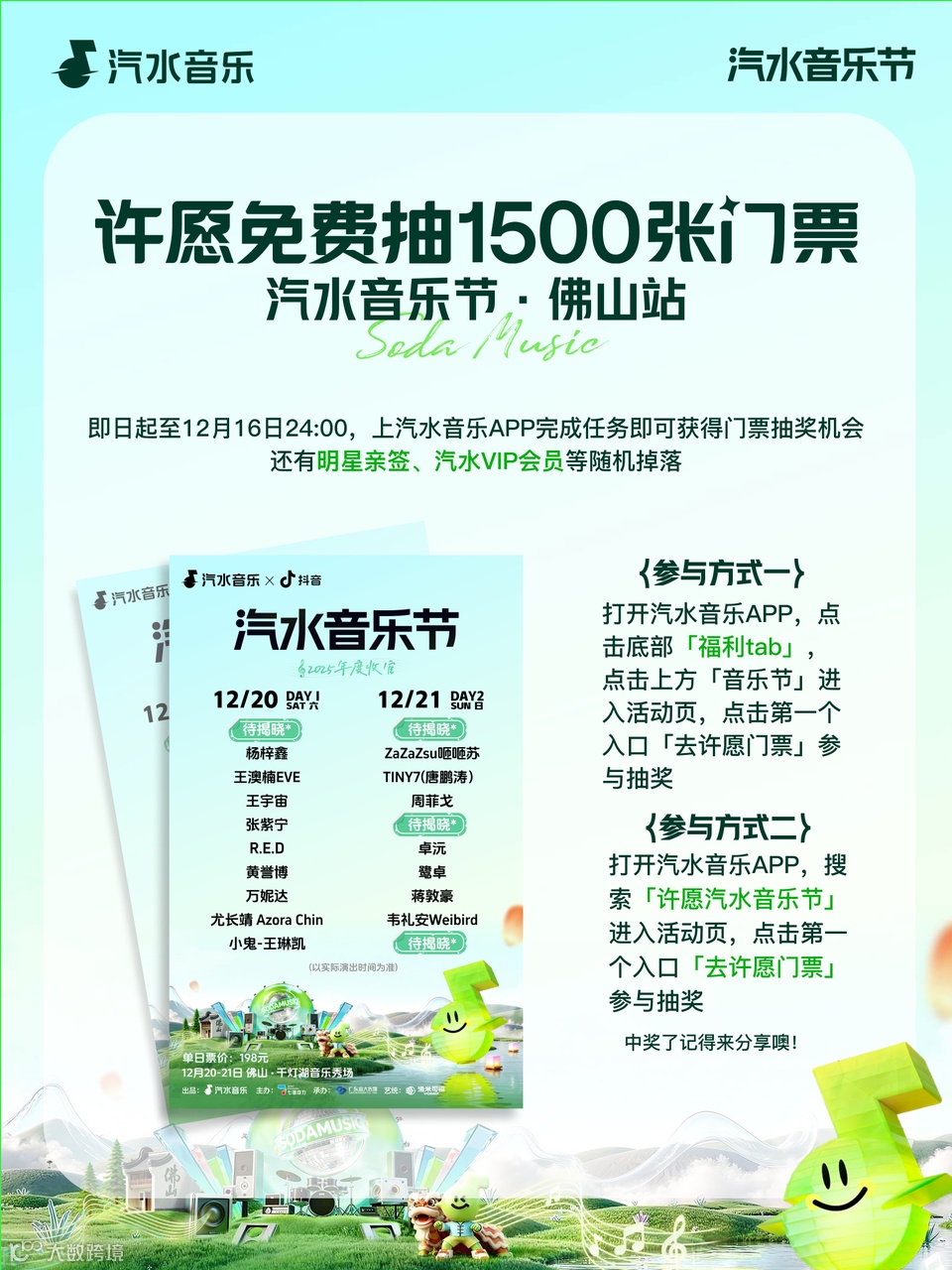 门票获取方式一:即日起至12月16日24:00,上汽水音乐APP完成任务,点击「去许愿门票」入口,就有机会获得1500张门票免费抽奖机会,还有明星亲签、汽水VIP会员等随机掉落!别再犹豫,12月20日-21日来「汽水音乐节·佛山站」,一起痛快释放,让这个时刻成为你2025年度最高光的回忆!
