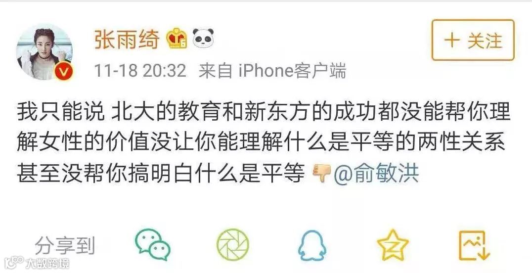 18日晚,演员张雨绮也在微博发文反驳俞敏洪的言论,截至目前,这条微博获得了60多万的点赞。