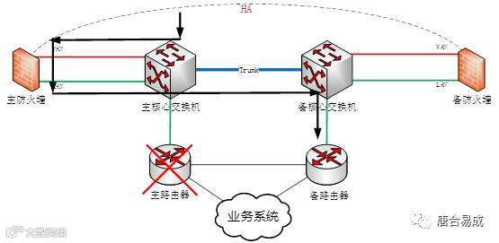 在如图3所示的拓扑中,如果主路由器出现故障,则业务流量会从主核心交换机到达备核心交换机再通过备路由器进入业务系统,详细业务流向如图7所示,在此场景下,业务不会中断。