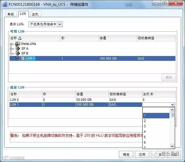 13.在“LUN“标签页上,打开SPA/SPB的目录树,选择相应的LUN,点击”添加“按钮。注意添加后请手动点选此LUN的”主机ID“,否则可能出现服务器认盘紊乱。在“主机”标签页选择此存储组指定的服务器。先前选择的LUN将挂载到此页选择的服务器上。