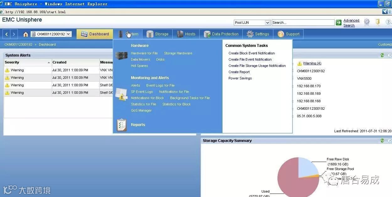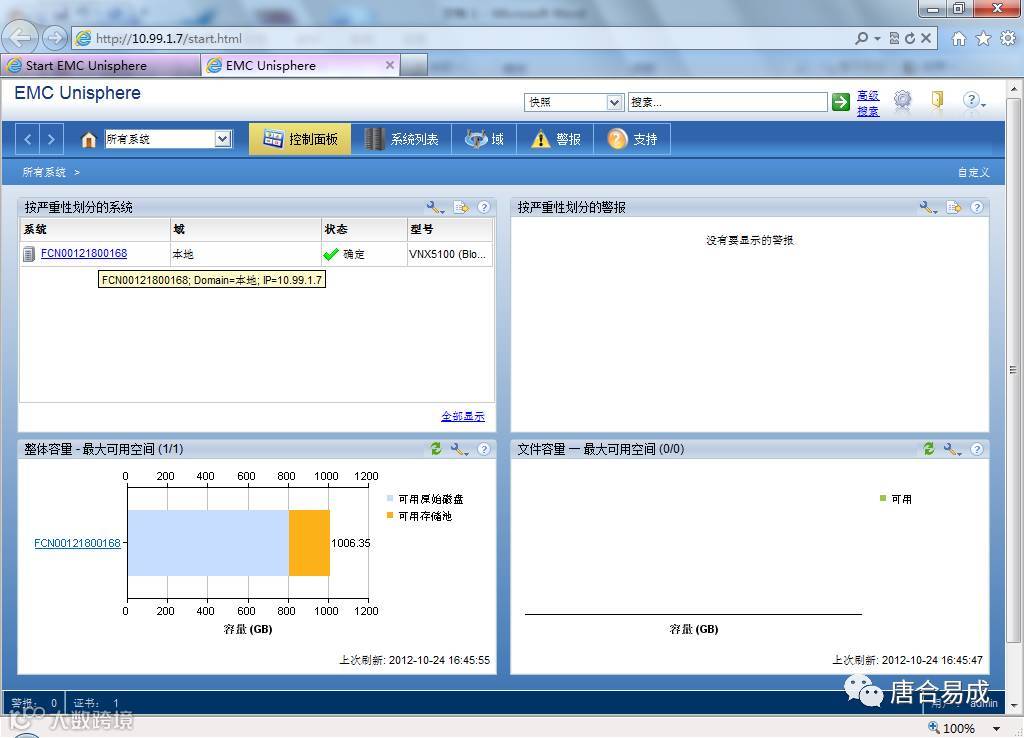 在浏览器地址栏中输入存储阵列SP管理口的ip地址,主存储http://1.1.1.1 (SPA)或者 http://1.1.1.2 (SPB),用户名为:admin,密码为:password;登陆存储系统,检查设备状态。(截图为引用)