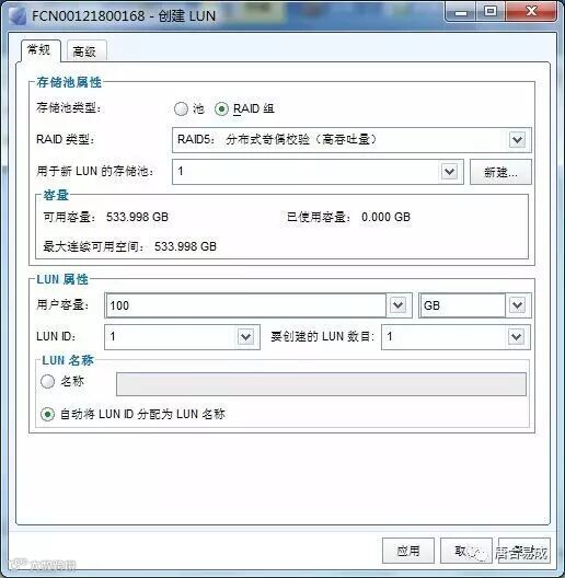 10.选择要划分LUN的raid组(通过“用于新LUN的存储池”ID选取)。在用户容量上输入要划分的lun的大小,lun id 和name不用更改。切换到高级标签页后,指定此LUN的所有者。为保证负载均衡,建议将lun均衡挂载在SPA和SPB上。