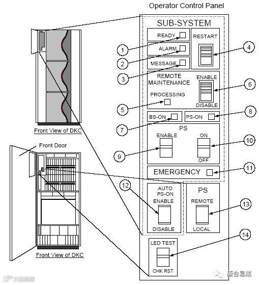 ※ 阵列下电完成后,关USP相应的断路器(在机柜的后面,每个机柜有两个断路器)。此时BS-ON⑦灯(黄色)熄灭。