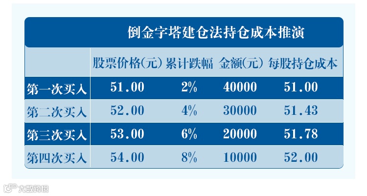 倒金字塔建仓法蕴含着“越跌越买”的思想,指的是一开始先用较少的资金买入,随着股票下跌幅度的加大逐步增加买入金额。
