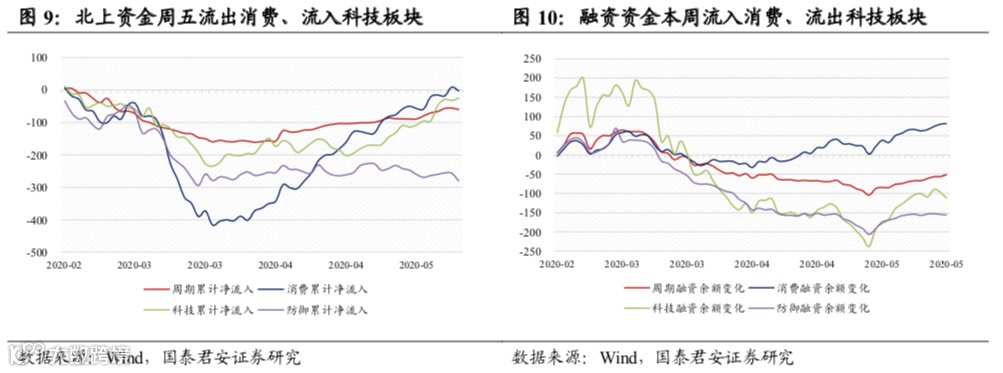 此外,5月中旬以来,北上资金、融资交易资金流入放缓,上周这2大“聪明钱”在消费、科技板块流向出现分歧。北上资金流出消费、防御板块较多,而融资资金开始明显流出科技板块,显示市场向上动能衰减。