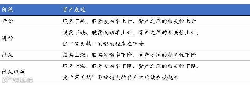 2 特点二:市场表现上,“黑天鹅”的开始和进行通常伴随着市场的下跌,结束时伴随着市场的上涨。