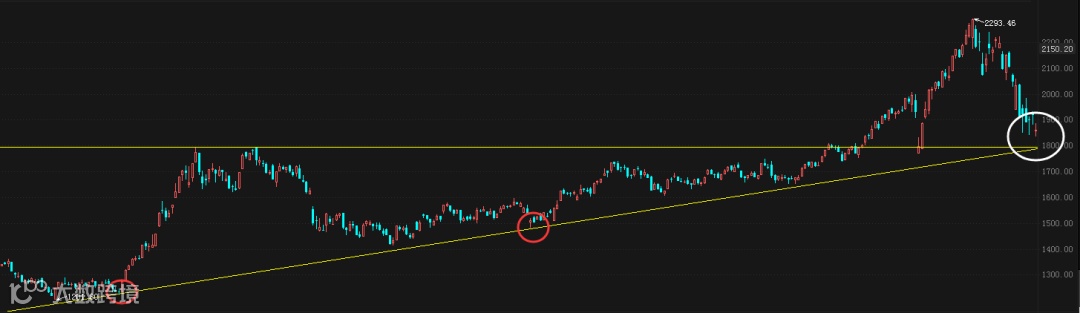 切换至上证综指月K线图,以998点和1849点两个A股历史上重要的低点做上升趋势线,目前指数在上方不远处运行,未来可以观察其支撑情况及力度。