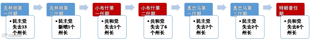 我们梳理了从克林顿任期以来的26年的州长选举结果(1993年至2019年),发现克林顿和奥巴马在第一任期内,州长选举均大幅落败于对手党派。