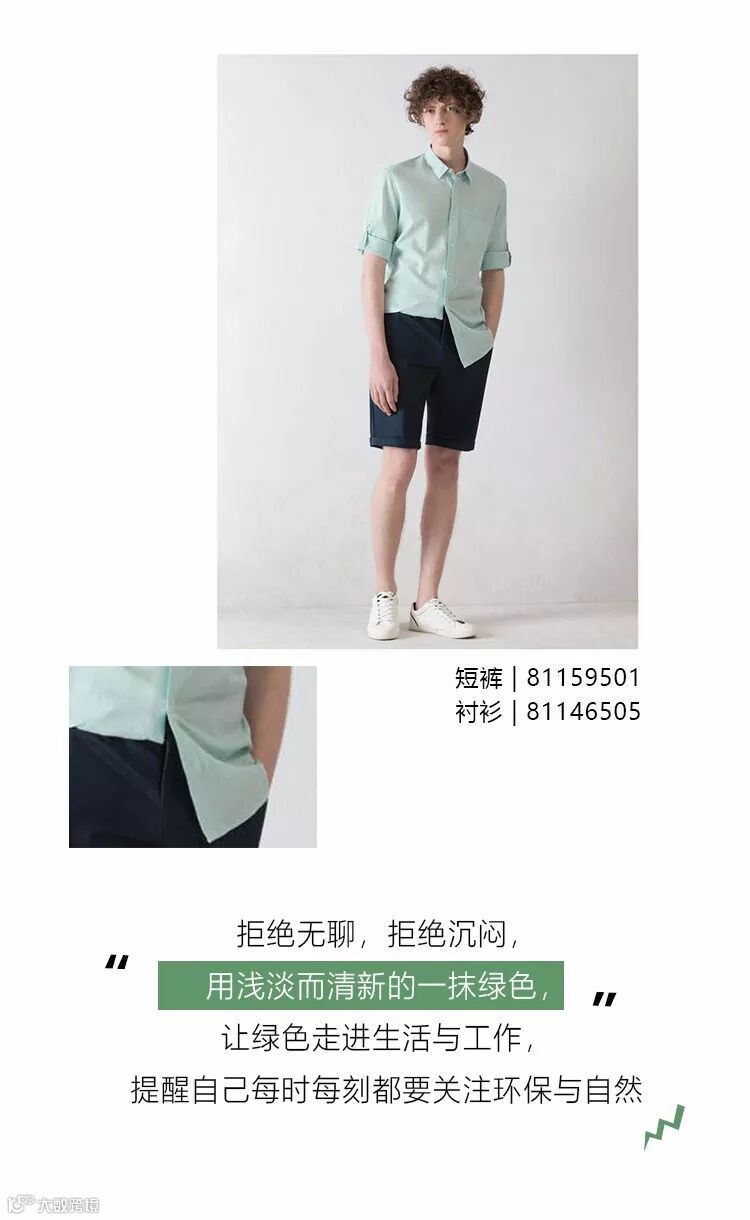 觉得单纯的行动还不够?那再给生活来点仪式感~穿一件淡绿衬衫,去拥抱绿色自然,或者着一身纯棉T恤,在职场中释放你的自然能量。