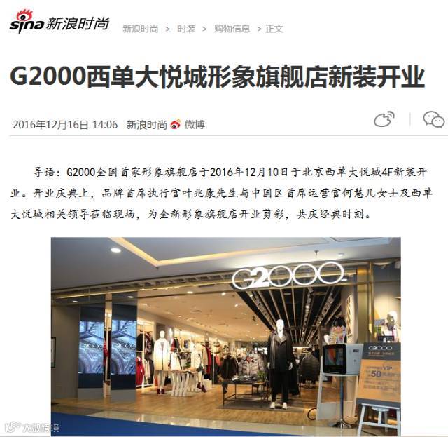 2016年12月10日,G2000国内首家最新品牌形象店在北京繁华商圈——西单大悦城举办了隆重的开业仪式。现场声势煊赫、门庭若市,牵动业界的盛事引来各大知名主流媒体的争相报道。