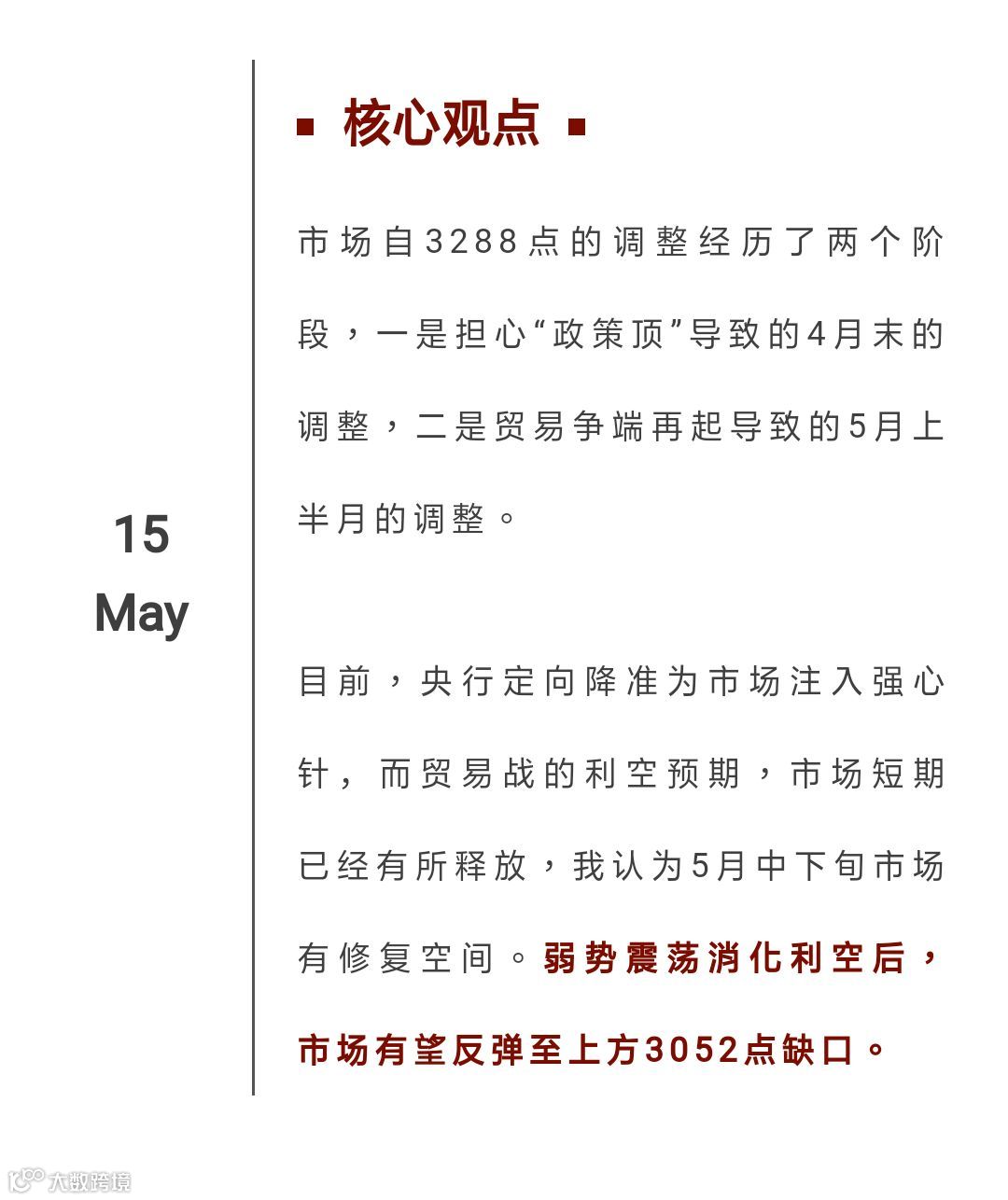 今年4月末,市场从3288点开始调整,经历了两个阶段:4月降准预期落空,导致市场担心政策顶出现,市场调整至3052点。而央行随后实施了定向降准,“政策顶”被证伪。