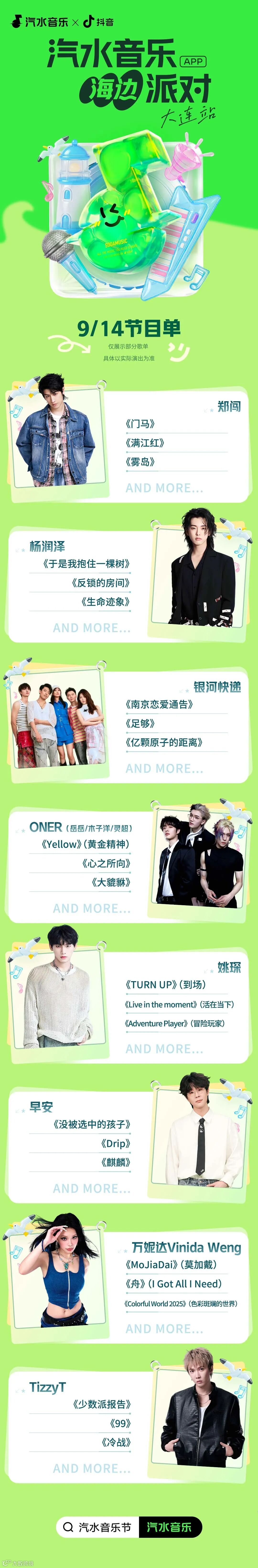 9月14日则集结了郑闯、杨润泽、银河快递、ONER(岳岳/木子洋/灵超)、姚琛、万妮达Vinida Weng、早安(D.M.G)、TizzyT 8组嘉宾,音乐风格横跨嘻哈、摇滚、独立、流行,期待点燃所有乐迷的热情,承包你的肾上腺素!