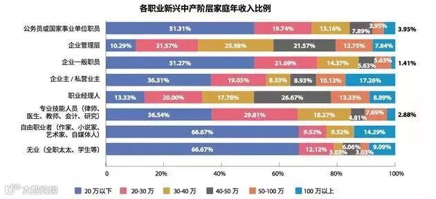此外,中国新增中产阶级中,私营业主这个职业的家庭百万年收入的比例是17.26%,为所有职业中最高比例,超过了专业技能人员和职业经理人非常多。