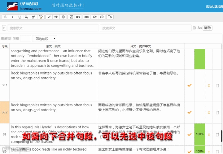当遇到两个句子翻译成一句更符合信,达,雅原则的情况时,点击合并按钮(页面上方菜单栏的锁链图标),将下一句合并到当前句段。