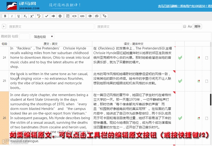 原文编辑功能除了可以合并、拆分原文句段外,还可以对原文内容进行编辑。具体操作方法如下: