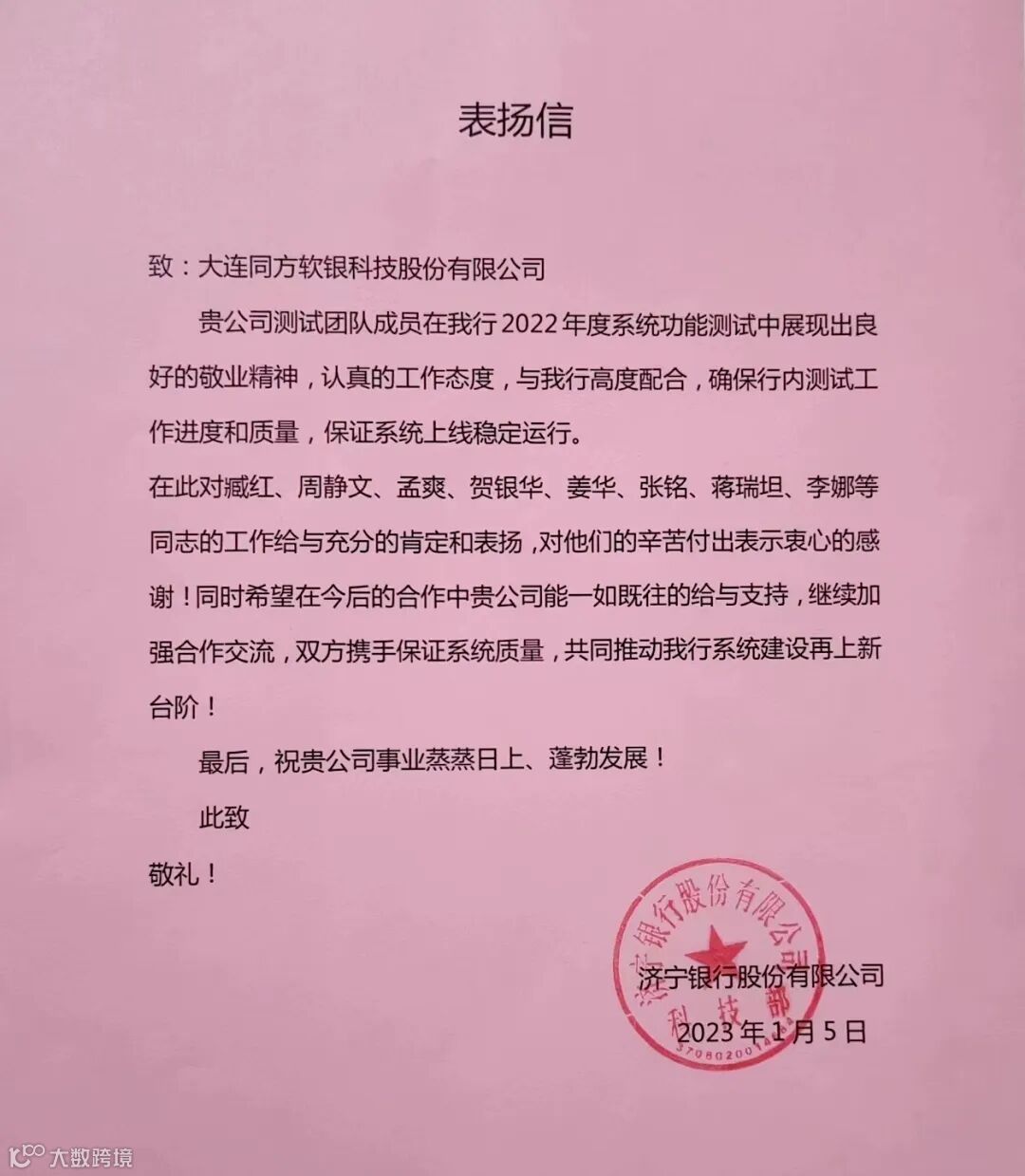 在第二封表扬信中,济宁银行对同方软银测试团队提出表扬。在2022年度行方系统功能测试工作中,我司测试人员展现出良好的敬业精神、认真的工作态度,与行方高度配合,确保行内测试工作进度和质量,保证系统上线稳定运行。其中,臧红、周静文、孟爽、贺银华、姜华、张铭、蒋瑞坦、李娜等同事获得了行方的充分肯定和表扬。同时,行方对他们的辛苦付出表示衷心感谢。