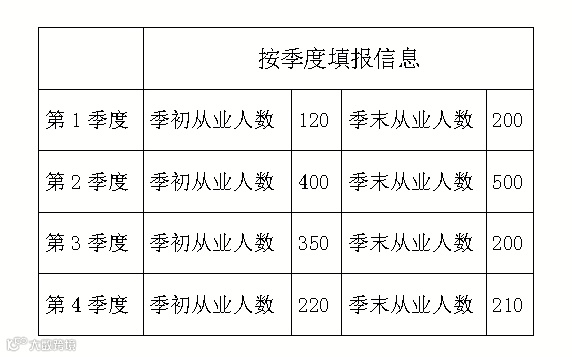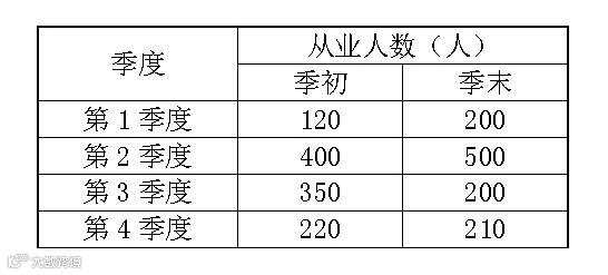 C公司从业人数的各季度平均值分别为:第1季度平均值=(120+200)÷2=160,第2季度平均值=(400+500)÷2=450,第3季度平均值=(350+200)÷2=275,第4季度平均值=(220+210)÷2=215。