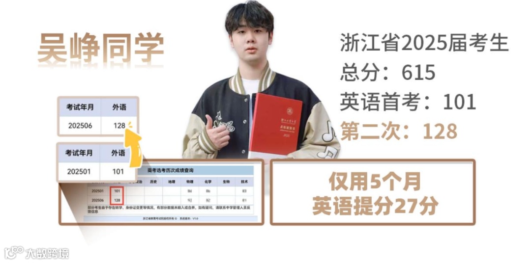 家长注意!孩子英语提分不用死刷题,天学网特邀“2025 年浙江高考英语从首考 101 分到高考 128 分,5 个月狂涨 27 分的学长,给您孩子分线实战经验~