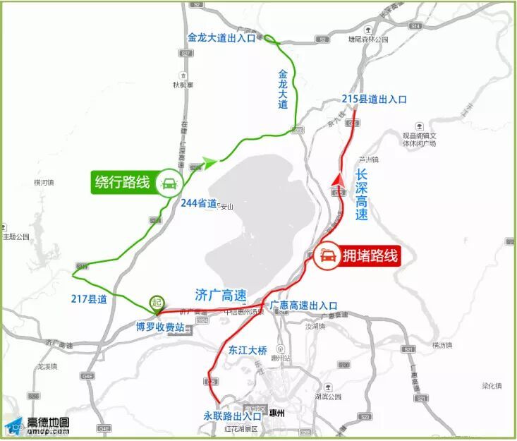 绕行路线2:从博罗收费站下高速,沿217县道-244省道-金龙大道行驶,在金龙大道出入口上广河高速。返程路线建议按此绕行路线返回。
