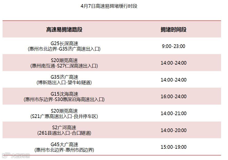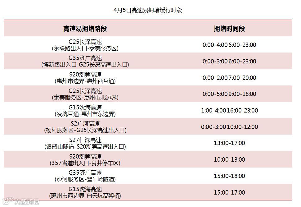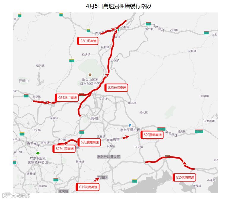 出行:根据高德地图交通大数据预测,清明节期间惠州市出行易拥堵缓行的高速有G25长深高速、G35济广高速、S20潮莞高速、S2广河高速、G15沈海高速等。