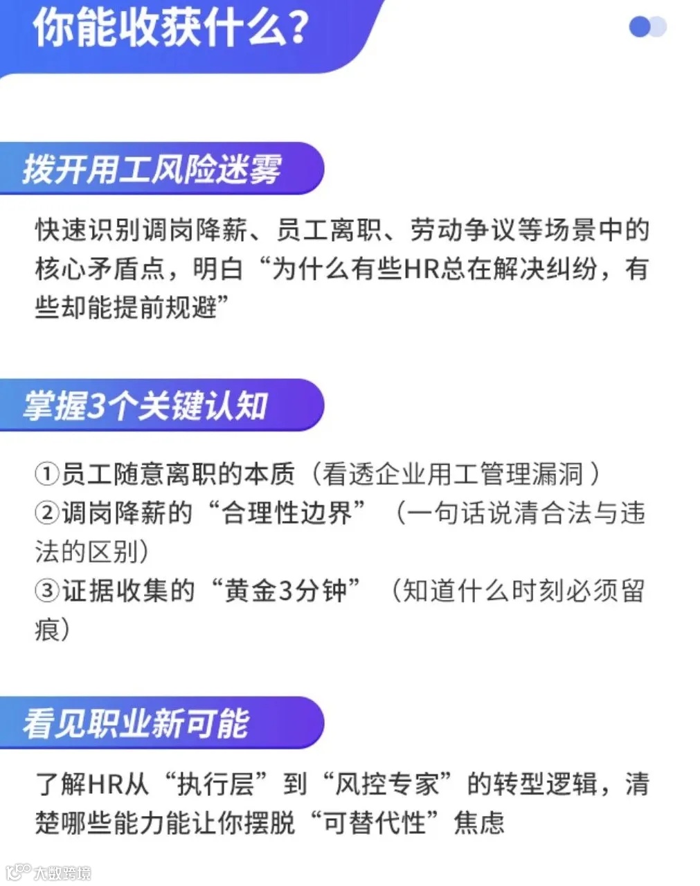 学了这门课,HR在公司业务转型、组织变革(如并购、裁员)、或采用新型用工模式(如平台用工、灵活用工)时,能够提供合规且风险可控的解决方案,保障战略顺利落地。