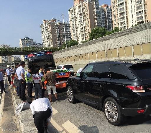 经记者现场初步了解,事故大致经过为:第一部白色小车减速行驶时,第二部小车也采取紧急刹车,随后几部小车刹车不及接连相撞,前后造成6车连环追尾。位于第四部位置的黑色小车,更是被第五部位置的的士直接从尾部拱起,压在的士车身上。而第六部车辆是一部路虎。