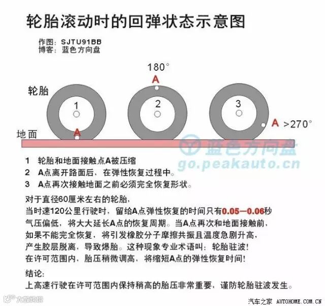 汽车的重量会使轮胎接触地面的部分稍有变形。汽车行驶时变形的部分离开了路面后将恢复原状(如图,轮胎回弹)。从轮胎表面一个点A点来看,轮胎转一次,这个点就发生一次弹性变形和弹性恢复的过程.变形和恢复是要时间的,重要的是恢复的时间必须小于轮胎的滚动周期。在高速行驶的时候,如果其轮胎弹性恢复速度赶不上轮胎的转速的话,就会在轮胎接地面后侧部位引起橡胶层的异常波动,这就是驻波现象(大家可以想象钱塘潮,前一浪没有完全退去,后一浪又上来了,一浪接一浪,浪打浪,力量有多大。轮胎驻波和海浪涨潮是一个道理。驻波时橡胶分子剧烈的摩擦而急剧升温,引起胎面橡胶层和帘布层等开始分离,能量越聚越多时轮胎无法承受了。怎么样?“膨”的一声。。。!!!!!爆胎了!