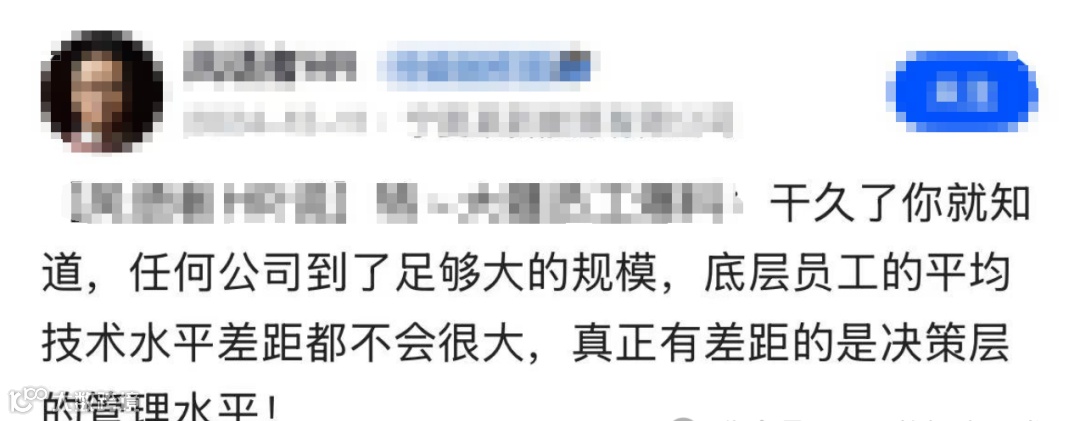 干久了你就知道,任何公司到了足够大的规模,底层员工的平均技术水平差距都不会很大,真正有差距的是决策层的管理水平!