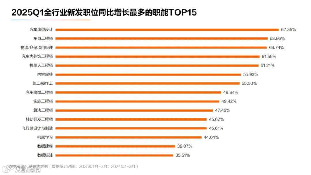 从猎聘今年一季度新发职位职位数据来看机器人工程师、算法工程师、机器学习、数据标注等一些AI相关职位数量同比去年增长明显。