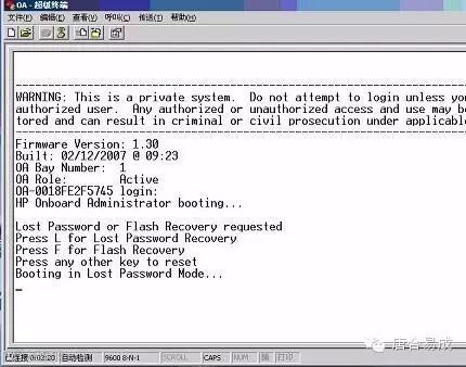 2. 这时按Onboard Administrator reset button for 5seconds.(5秒)出现如下提示,按字母L后,等待大约10秒钟时间。