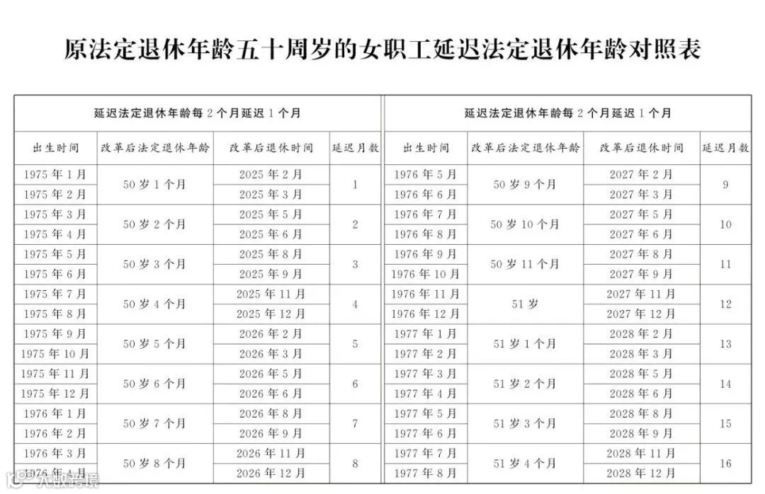 具体的原法定退休年龄为五十周岁的女职工延迟法定退休年龄对照表如下图所示⬇️