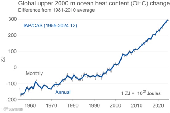 2024年海洋的异常升温是全球高温的关键因素。根据中国科学院大气物理研究所程立军教授团队发表在《大气科学进展》上的研究,2024年全球海洋不仅表面温度创新高,上层2000米的海洋热量也达到了有记录以来的峰值。数据显示,从2023年到2024年,全球海洋上层2000米的热量增加了16泽焦耳(ZJ,1泽焦耳=10²¹焦耳),相当于2023年全球总发电量的140倍。