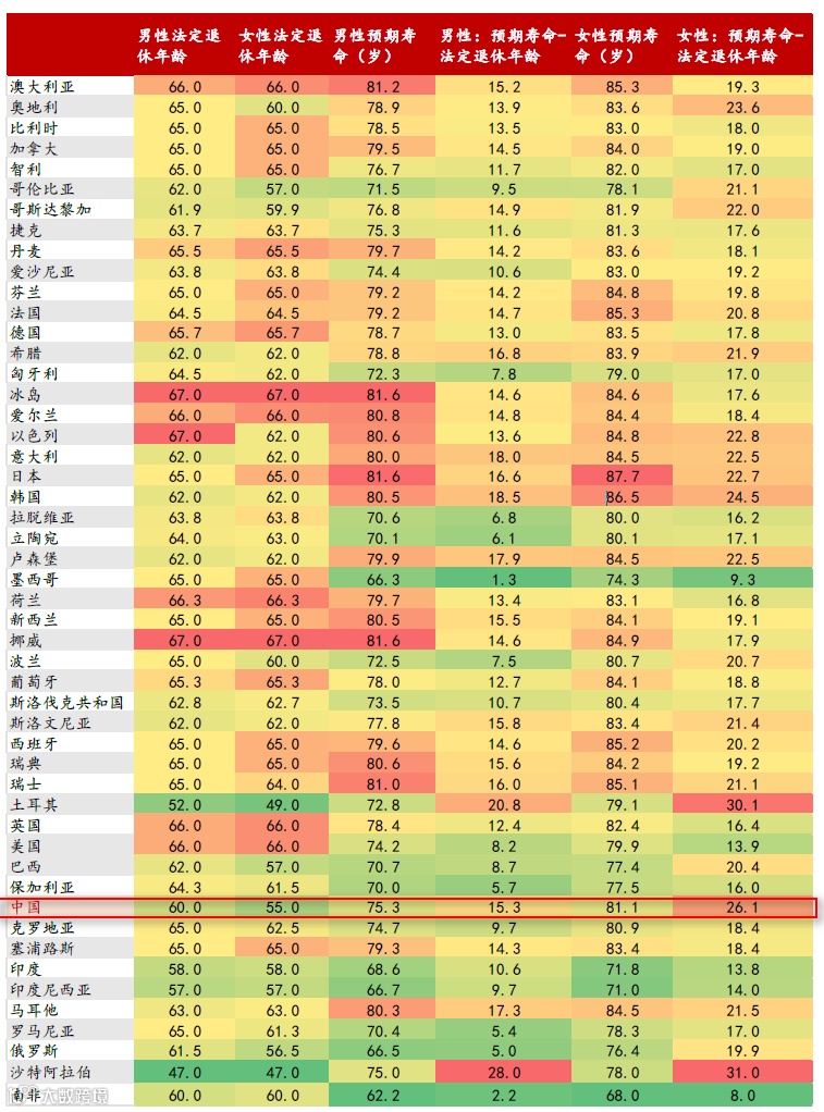 男性平均法定退休年龄为63.4岁,女性为62.3岁,高于我国现行的男性60岁、女性55/50岁。