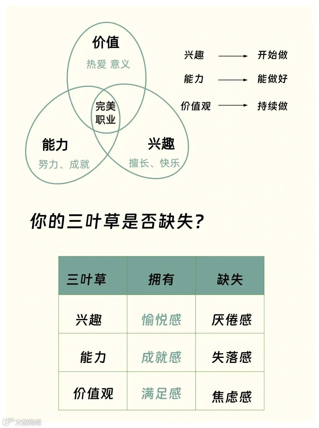 做职业规划有非常多的工具可以参考使用,这些工具和模型可以排查自己的能力情况,找到问题所在,针对性的去解决:霍兰德职业兴趣、DISC、生涯彩虹分析、职场价值观测评、传统三叶草等,来访者制定行动计划等。