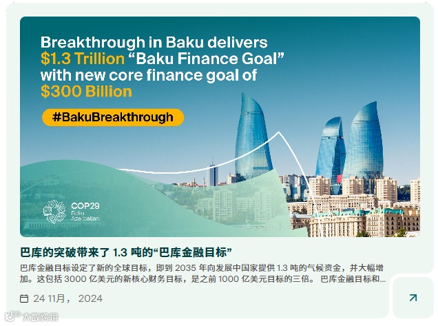 2024年11月24日凌晨5点31,《联合国气候变化框架公约》第29次缔约方大会(COP29)于阿塞拜疆首都巴库正式闭幕,达成了名为“巴库气候团结契约”的一揽子平衡成果,包括达成发达国家到2035年之前每年向发展中国家提供“至少”3000亿美元气候融资协议,各国还就联合国支持下的全球碳市场规则达成了一致,