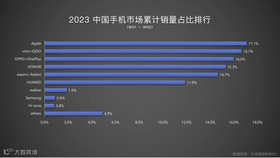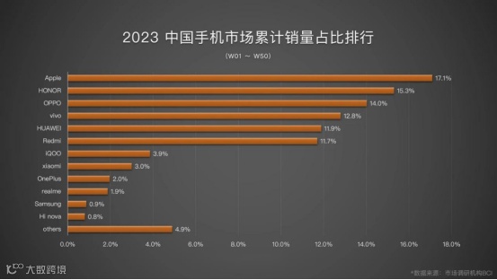 由于智能手机需求相对饱和,以及消费者对手机外观、品质及功能等需求的不断提高,手机市场竞争加剧。根据市场调研机构BCI数据显示,在2023年W1-W50期间,小米公司旗下Redmi红米手机销量占2023中国手机市场累计销量的11.7%,而小米手机仅占3%。