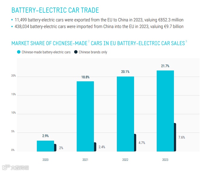 根据欧洲汽车工业协会提供的数据显示:去年欧盟出口中国的电动车数量为11499辆,价值不到9亿欧元,而中国出口到欧盟的电动车数量为43.8万辆,价值近100亿欧元。2023年产自中国的电动车占据了欧盟电动车市场21.7%份额,其中中国品牌电动车占据7.6%份额。