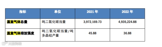除了终端产品发电产生的减排收益,企业对公司产生的温室气体总量做了统计,大全近两年数据显示,其2021年~2022年温室气体排放总量有所上升,但生产每吨多晶硅排放的温室气体下降明显。