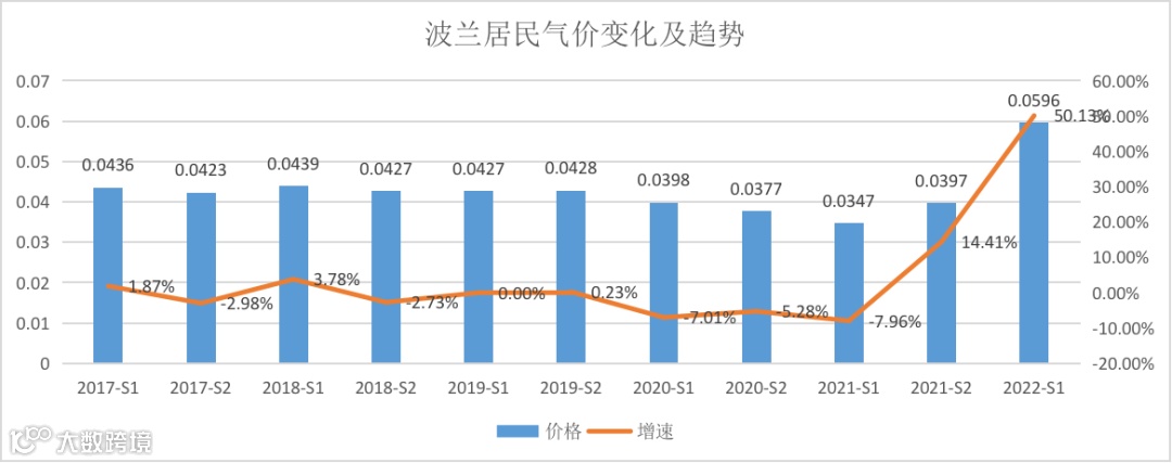 不同国土面积、经济发展水平的欧盟国家中,居民气价从2021年下半年开始都有了非常大规模的增长。2022年上半年,尽管有些国家的气价增速放缓(冬季结束后,需求减少),但价格本身依然保持了增长的态势。