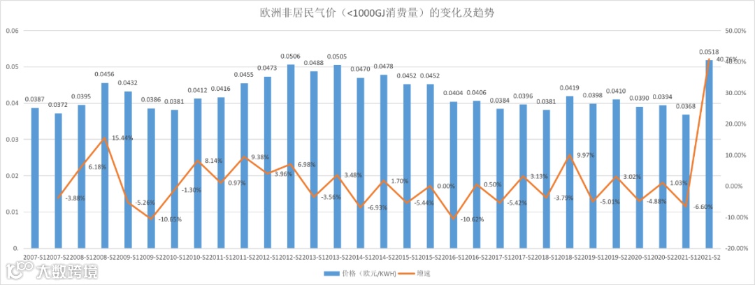 但是2021年下半年欧洲的非居民气价直线上升,用气量大的用户涨幅甚至还要高于用气量低的用户。