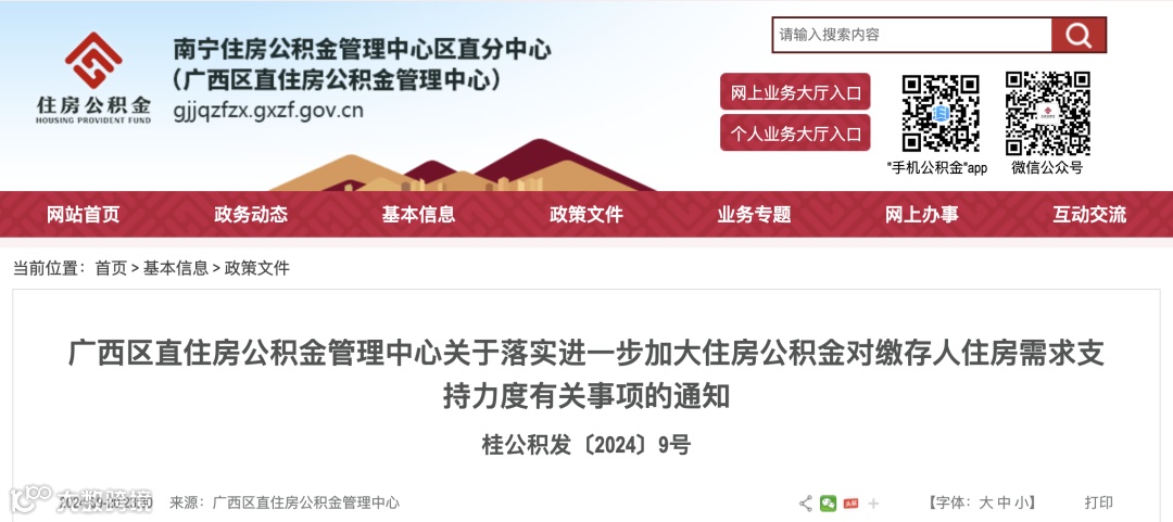 9月29日,广西区直住房公积金管理中心发布了《广西区直住房公积金管理中心关于落实进一步加大住房公积金对缴存人住房需求支持力度有关事项的通知》(桂公积发〔2024〕9号),该《通知》自2024年10月1日起实施。