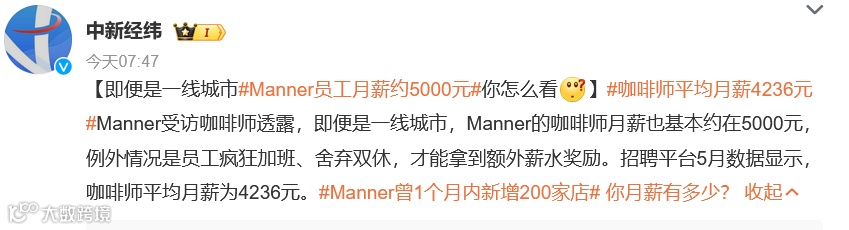 据中新经纬报道,Manner受访咖啡师透露,即便是一线城市,Manner的咖啡师月薪也基本约在5000元,例外情况是员工疯狂加班、舍弃双休,才能拿到额外薪水奖励。招聘平台5月数据显示,咖啡师平均月薪为4236元。