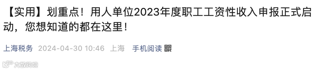 值得关注的是,4月30日,上海税务官方微信公众号发布了《【实用】划重点!用人单位2023年度职工工资性收入申报正式启动,您想知道的都在这里!》一文,明确上海市2024年社保基数申报自5月1日正式启动。