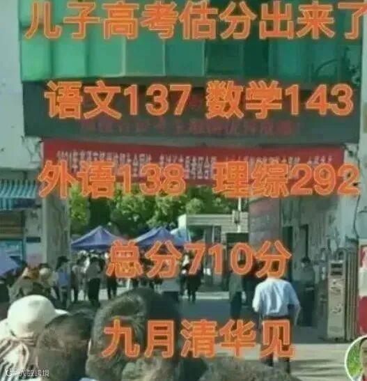这位家长的孩子在考试后很快估算了自己的分数,算出总分710分的高分,喜不自胜的家长将这个估分成绩发到网上,骄傲的说:九月清华见。