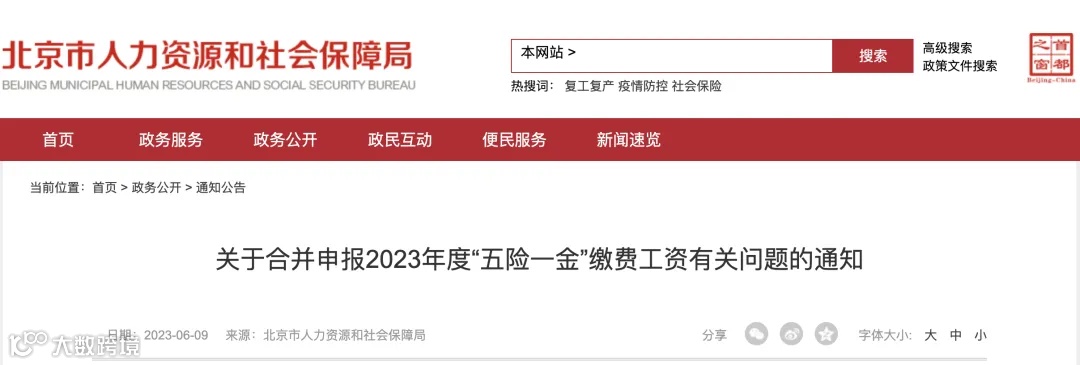 2023年6月9日,北京市人力资源和社会保障局、国家税务总局北京市税务局、北京市医疗保障局和北京住房公积金管理中心联合发布《关于合并申报2023年度“五险一金”缴费工资有关问题的通知》。