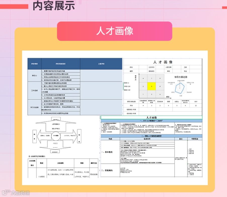 其中面试前的“人才画像”资料包里的岗位认知资格标准、岗位胜任力测评表、公司岗位胜任素质模型设计方案等资料,能让你从招聘之初就明确招聘目标和标准,不走弯路。