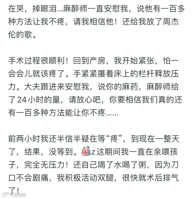 分院生产过的网友说,手术前,麻醉师不仅放音乐安抚她,还给了足够剂量的麻药,缓解她的紧张和疼痛。