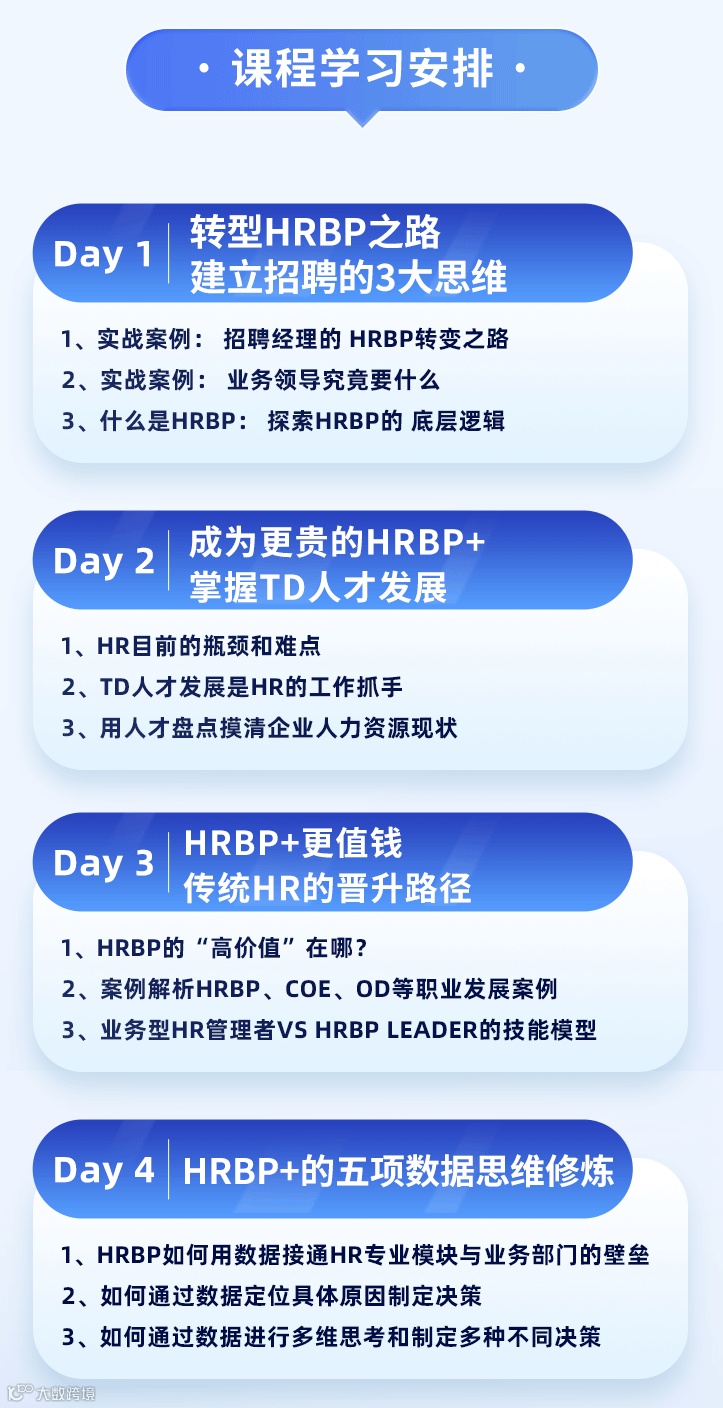 通过四天的学习后,你将收获HRBP的招聘管理、人才发展的运用、传统HR晋升的路径等技能。